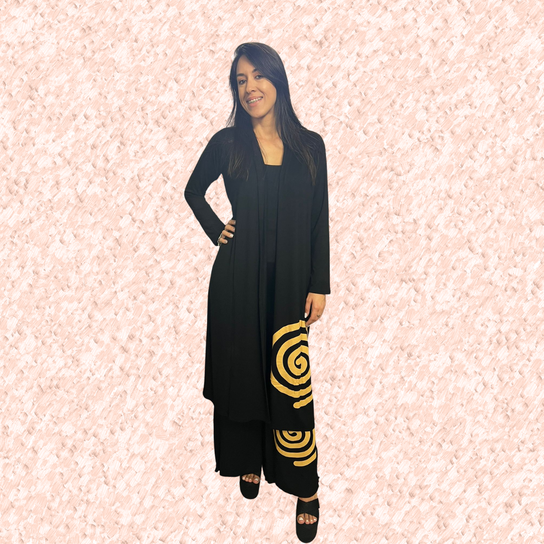 Conjunto de chaleco largo con magas largas y pantalón tipo palazo. Diseño en enpiral en el chaleco en la parte de frente y atrás, ademas en el pantalón.